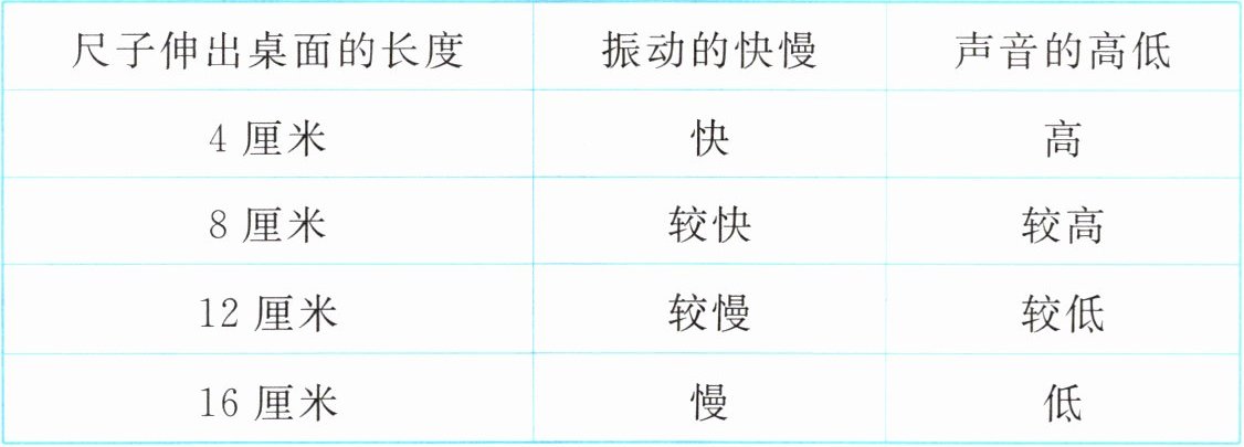 2. 下面是研究尺子伸出桌面的长短与音高的变化记录表,根据记录表完成下列问题。