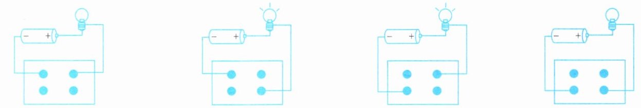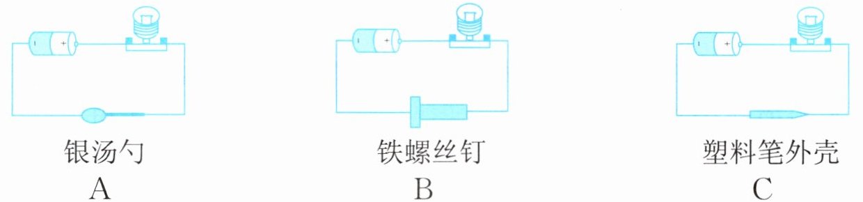 10. 如图所示,用导线把灯泡、电池和三种物品分别相连,小灯泡一定不发光的是( )。