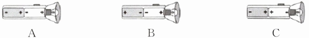 13. 在下图所示的装有两节干电池的手电筒的结构示意图中,能使手电筒正常工作的是( )。