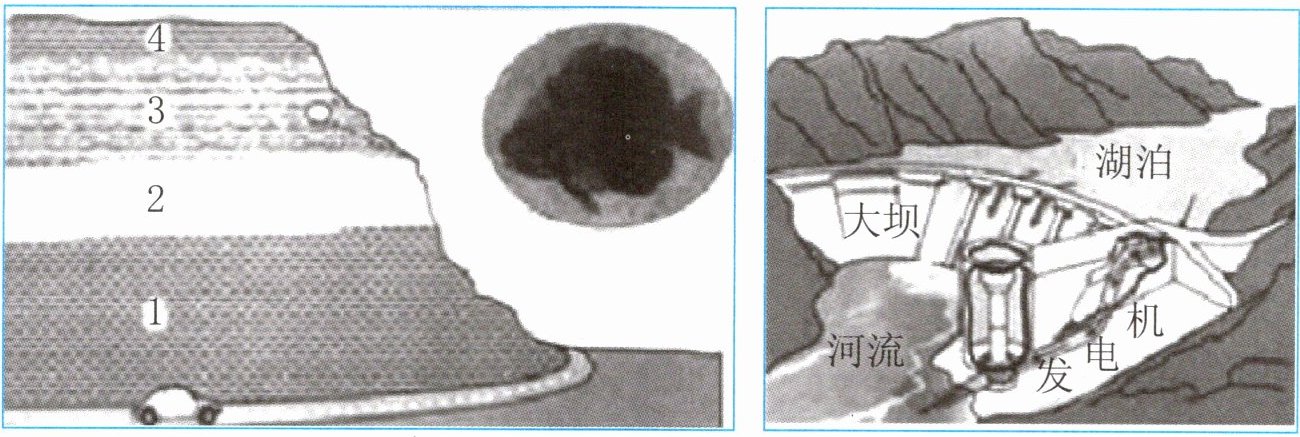 2. 暑假,小明一家开着新能源纯电动汽车,去某地的水力发电站参观。途经一处山坡时,小明发现山体具有明显的层状分布。父亲说,当初修路时,在3号岩层中曾经发现了大量的鱼类化石,如图。