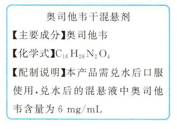 2. 春季是流感高发的季节,奥司他韦作为抗流感药物成为了家中的常备药品。如图是奥司他韦干混悬剂的相关信息,请计算: