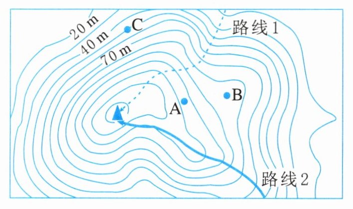 2. 若要选出一个地势平坦开阔的地方,作为1、2两条路线登山同学的集中休息点。应选择A还是B? 结合等高线特点说明理由:________________________。