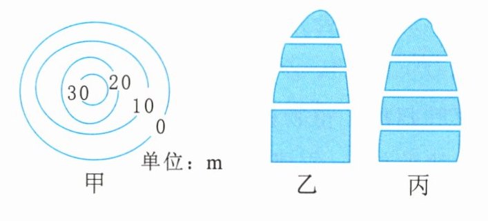 3. 研学后,小明利用红薯、刀片、记号笔、竹签等材料绘制等高线地形图。他将半个红薯模拟山峰,切成4片后用竹签串好在白纸上依次描出每片红薯的边缘线,绘制出如甲所示的等高线地形图。下列两种切法合理的是______(填“乙”或“丙”)。