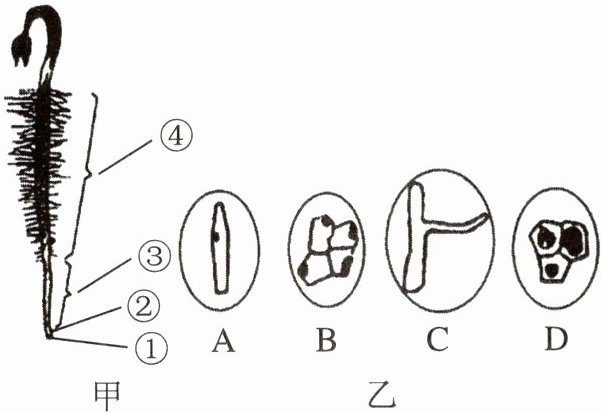 2. 如图所示,图甲为肉眼看到的幼苗的幼根,图乙为显微镜下观察到的四类细胞的形态结构,请据图回答问题。