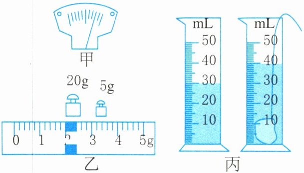 5. 如图所示的是做“测量固体的密度”实验时的部分场景。天平使用前指针位置如图甲所示,则应向________调节平衡螺母;天平调节好后,往左盘放固体,右盘放砝码,调节游码直至天平再度平衡,如图乙所示,固体的质量为________g;测量固体体积的过程如图丙所示,则该固体的密度为________kg/m³。