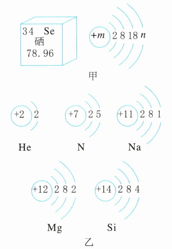 2. 2024年6月,“嫦娥六号”成功实现月球背面南极地区月壤采集,经分析得出月球上含有He、N、Na、Mg、Si、Se等元素。如图甲所示为硒元素在元素周期表中的部分信息及其原子结构示意图,如图乙所示为其他原子结构示意图。