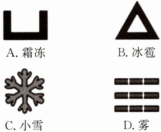 1. 如图所示符号分别代表霜冻、冰雹、小雪、雾四种天气,其中通过液化形成是( )