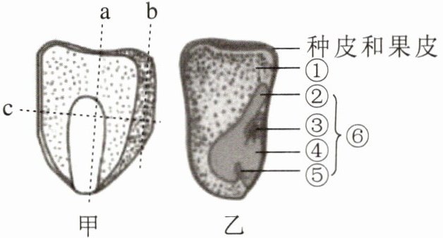 (1)图乙是玉米种子的剖面图,该剖面是用刀片沿着图甲所示的________(填“a”“b”或“c”)线剖开。
