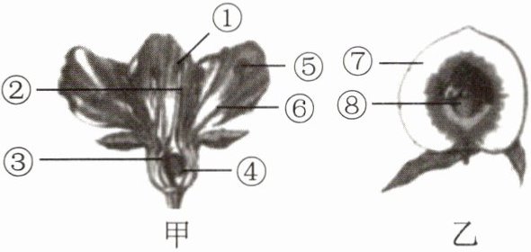 2. 如图甲是桃花的结构示意图,图乙是桃的果实示意图。分析回答下列问题。