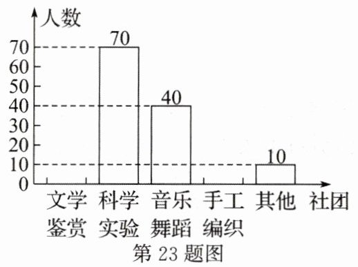23. 为了深化改革,某校积极开展校本课程建设,计划成立“文学鉴赏”“科学实验”“音乐舞蹈”和“手工编织”等多个社团,要求每位学生都自主选择其中一个社团。为此,随机调查了本校各年级部分学生选择社团的意向,并将调查结果绘制成如下统计图表(不完整):