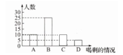21. 生活中很多矿泉水没有喝完便被扔掉,造成极大的浪费,为此数学兴趣小组的同学对某单位的某次会议所用矿泉水的浪费情况进行调查。在为期半天的会议中,每人发一瓶$500$毫升的矿泉水,会后对所发矿泉水喝的情况进行统计,大致可分为四种:$A$. 全部喝完;$B$. 喝剩约$\frac{1}{3}$;$C$. 喝剩约一半;$D$. 开瓶但基本未喝。同学们根据统计结果绘制成下面的两幅统计图。根据统计图提供的信息,解答下列问题: