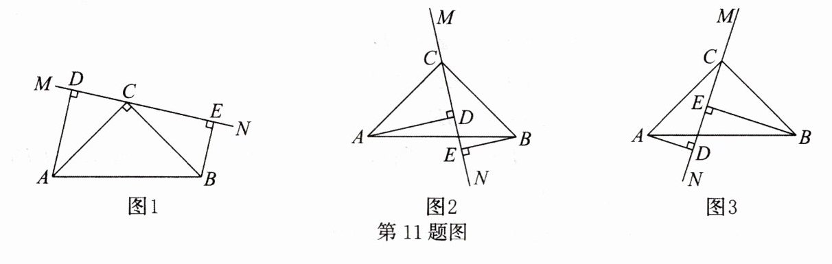 11. 在$\triangle ABC$中,$∠ACB=90^{\circ },AC=BC$,直线$MN$经过点$C$,且$AD⊥MN$于点$D,BE⊥MN$于点$E$。