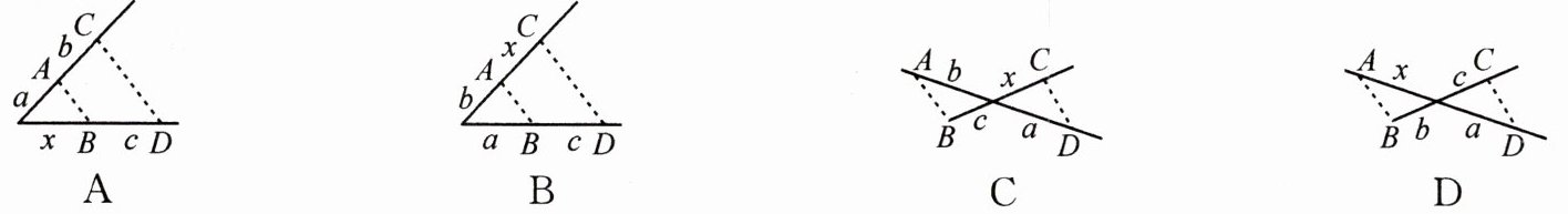 3. 已知线段a,b,c,求作线段x,使$a:b=c:x$,则下列作图中$(AB// CD)$作法正确的是(