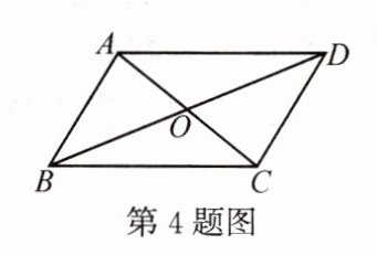 4. 如图,$□ ABCD$的对角线$AC$,$BD$相交于点$O$。如果$AD = 5\mathrm{cm}$,$AB = 3\mathrm{cm}$,那么$\triangle AOD$的周长与$\triangle AOB$的周长之差为(