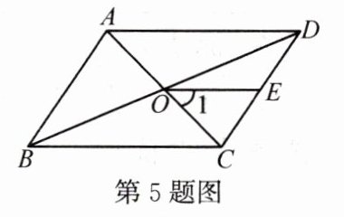 5. 如图,在$□ ABCD$中,对角线$AC$与$BD$相交于点$O$,点$E$是边$CD$的中点,连结$OE$。若$\angle ABC = 60^{\circ}$,$\angle BAC = 80^{\circ}$,则$\angle 1$的度数为(