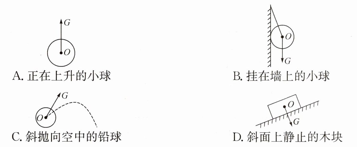 铅球的重力 $ G = mg = 2\ \text{kg} \times 10\ \text{N/kg} = 20\ \text{N} $,选标度为 10 N,从球心竖直向下画,符号为 G,如图所示: