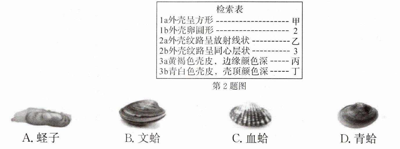 2. 某同学根据常见贝类的外部特征编制了如上检索表。表中“乙”对应的是 ()