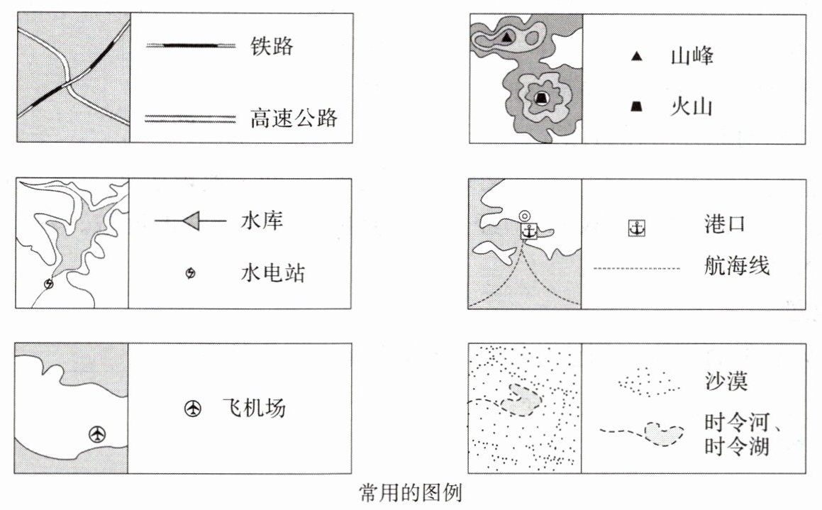 (4)地图的比例尺大小不同,适用性也不一样。一般大比例尺地图(大于或等于1:100000)表示的范围小,描述的内容比较详细;小比例尺地图(小于或等于1:1000000)表示的范围大,描述的内容比较粗略。