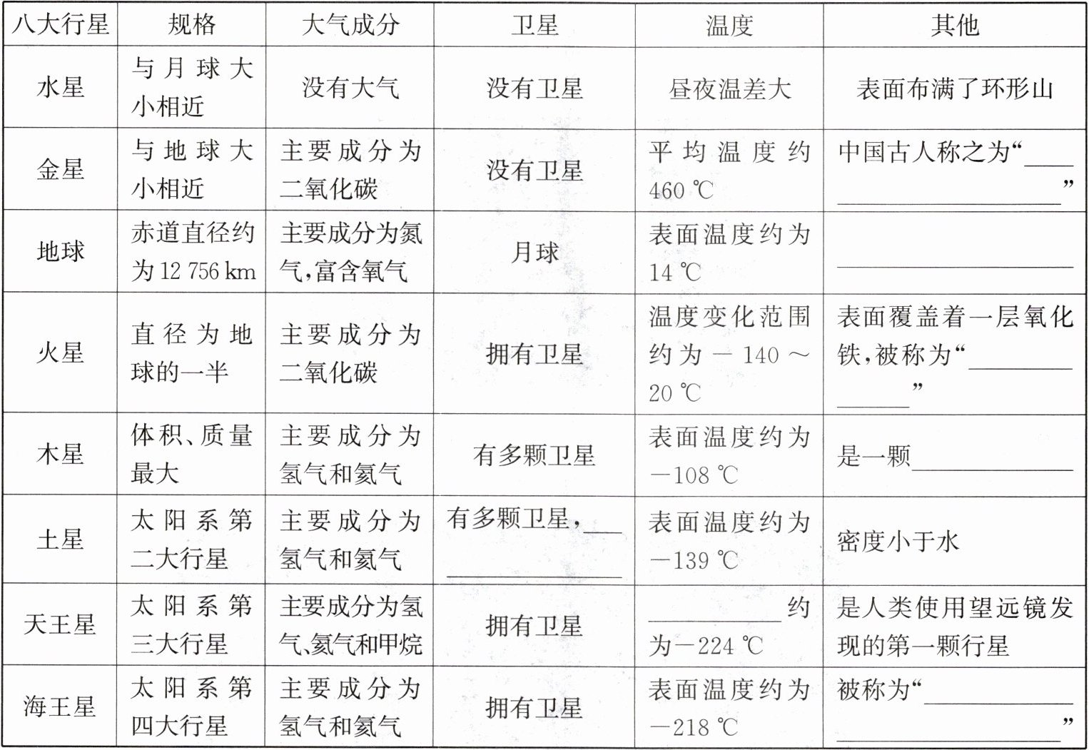 同一平面的近似圆形轨道 公转 金星 启明星 表面有液态水 红色行星 气态巨行星 最大的卫星比水星还大 最低温度 笔尖下发现的行星