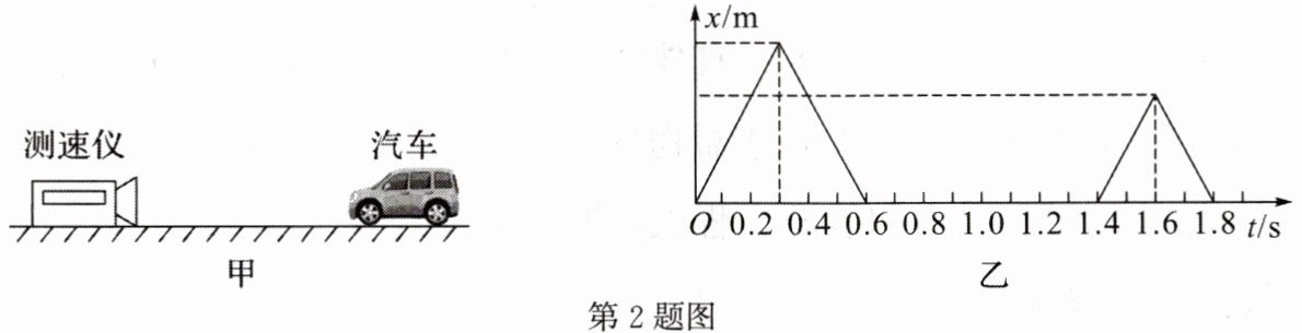 2. 交通部门常用测速仪来检测车速,测速原理是测速仪前后两次发出并接收到被测车反射回的超声波信号,再根据两次信号的时间差,测出车速,如图甲。某次测速中,测速仪发出与接收超声波的情况如图乙所示,x表示超声波与测速仪之间的距离。下列说法中错误的是(假设超声波的速度为340m/s,且声速与车速均保持不变) ()