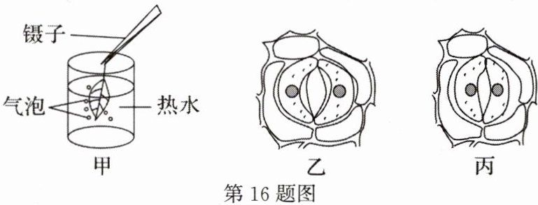 16. 如图甲是小科想探究“叶片哪一面气孔数目多”所进行的实验;图乙、丙为某陆生植物叶表皮中的不同状态下的保卫细胞。下列叙述中正确的是()