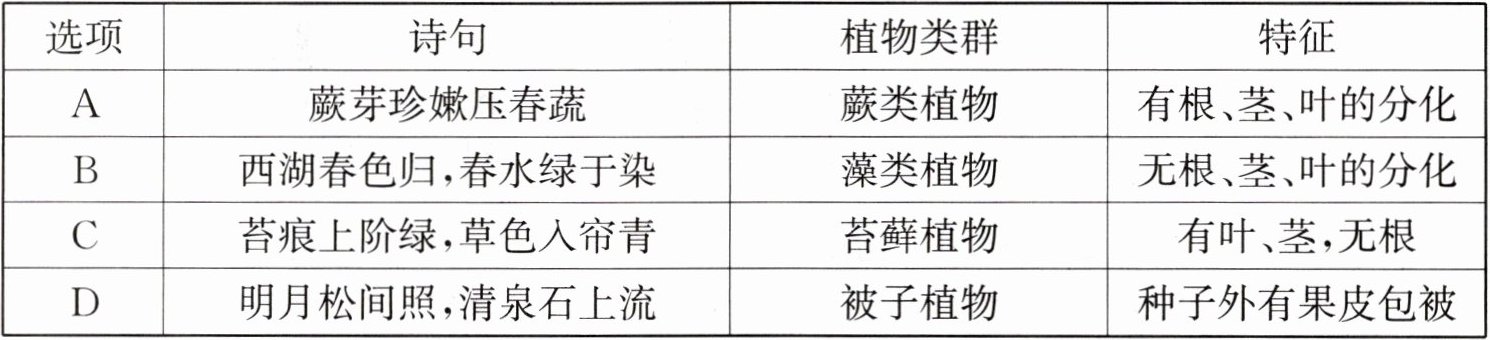 变式2 古诗词中蕴含丰富的生物学知识,彰显出自然之美、生命之美。下列诗句中描述的植物、所属的植物类群和特征不相符的是 ()