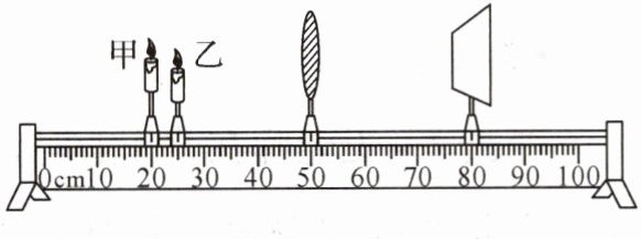 【解析】根据凸透镜成像情况进行判断:$u = v = 2f$,成倒立、等大的实像;$2f>u>f$,$v>2f$,成倒立、放大的实像。由图可知,甲蜡烛的物距$u = 50cm - 20cm = 30cm = 2f$,乙蜡烛的物距$2f>u = 50cm - 25cm = 25cm>f$,而光屏到凸透镜的距离$s = 80cm - 50cm = 30cm = 2f$,根据$u = v = 2f$,成倒立、等大的实像;$2f>u>f$,$v>2f$,成倒立、放大的实像可知,甲蜡烛的像等大、清晰,乙蜡烛的像倒立、模糊,故A、B、D错误,C正确。