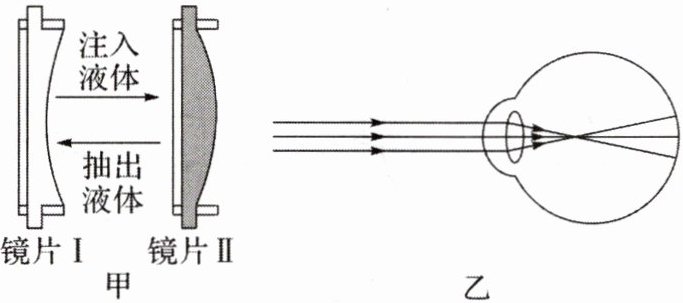 【解析】近视眼是像成在视网膜的前方,应佩戴凹透镜矫正;远视眼是像成在了视网膜的后方,应佩戴凸透镜矫正。由图乙可知,某人看远处物体时,像成在了视网膜的前方,所以是近视眼,需要佩戴对光线具有发散作用的凹透镜矫正,由图可知,镜片Ⅰ是凹透镜,镜片Ⅱ是凸透镜,故应佩戴Ⅰ。