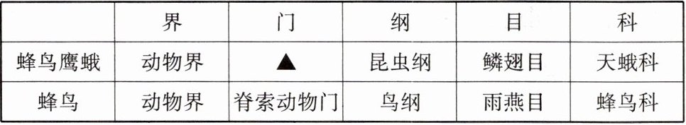 例4 比较是根据研究对象的特征来认识对象的相同点或相异点的方法。蜂鸟鹰蛾和蜂鸟无论是外形、体重,还是生活习性、飞行速度都极其相似,但是它们也存在许多区别。如表为两种生物的分类等级示意图,下列描述错误的是 ()