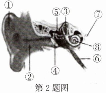 2. 下图分析判断:“遇到巨大的声响迅速张口以免被震破的、将鼓膜的振动传到耳内的、将外界的刺激转变为神经冲动的、将神经冲动传到大脑皮层听觉中枢的”结构依次是()