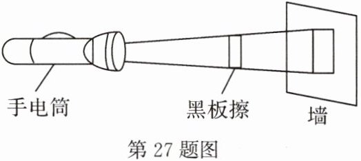 27. (8分)小东与几位同学做手影游戏时发现,手影大小经常在改变,影子的大小与哪些因素有关?