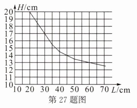 (2)为了进一步发现其中的规律,他们根据数据绘制了影子高度H 随手电筒到黑板擦距离L变化的图像(如图)。由图像可知,当手电筒到黑板擦的距离L= 35 cm时,影子的高度H大致是____cm。