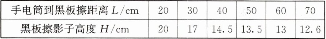 他猜想:影子的大小可能与光源到物体的距离有关,他们借助如图所示的实验装置,来探究影子高度与光源到物体距离的关系。实验中,把手电筒正对黑板擦由近及远先后放在距离黑板擦不同位置,保持其他因素不变,分别测量影子在墙面上的高度。记录数据如下表: