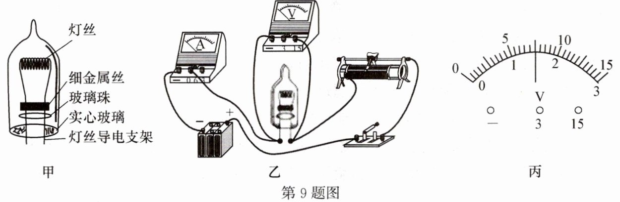 9. 小科同学发现圣诞树上小彩灯的连接方式为串联,当其中一只小彩灯的灯丝熔断后,其余的小彩灯还能继续发光,这是为什么? 他请教了科技人员,得到以下信息:小彩灯规格是“$2.5V$ $0.25A$”,小彩灯的构造如图甲所示,细金属丝表面涂有绝缘物质,在正常(低压)时不导通,若加上较高电压(如$220V$)时,细金属丝表面的绝缘层被击穿。取一只完好的小彩灯,按如图乙电路进行实验,电源电压为$7.5V$。
