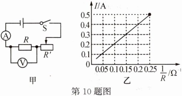 10. 小明利用图甲所示的电路探究“通过导体的电流与电阻的关系”,根据实验的数据绘出了$I-\frac{1}{R}$图像,如图乙所示,分析图像可知,当导体的电阻为______$\Omega$时,通过它的电流为$0.2A$,当电流分别为$0.25A和0.5A$时,接入电路的导体的电阻之比为______;实验过程中,小明控制导体两端的电压为______V。