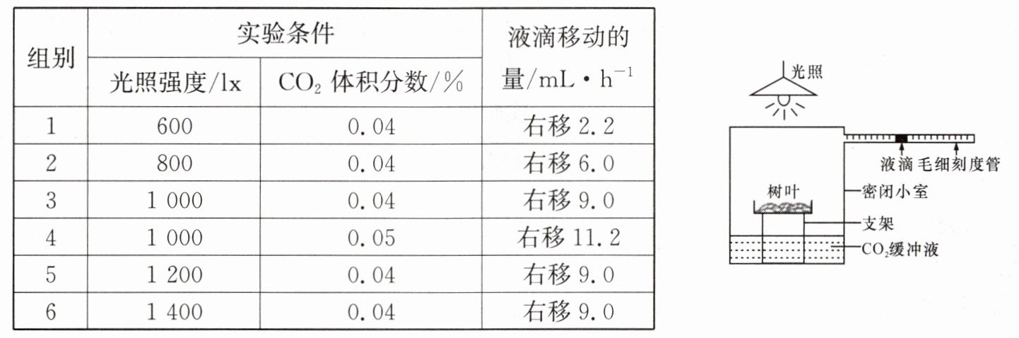 例5 用如图所示装置研究$CO_{2}$含量和光照强度对某种树叶光合作用的影响,在$25^{\circ }C$的室温下,利用生长状况相同的若干同种鲜树叶进行实验($CO_{2}缓冲液能调节密闭小室内CO_{2}$浓度保持相对恒定),测量结果如表。请分析回答: