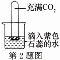 2. 如图,将充满$CO_{2}$的试管倒扣在滴有紫色石蕊的蒸馏水中,一段时间后,下列实验现象描述正确的是 ( )