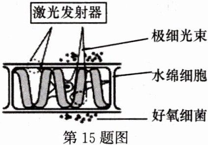 15. 科学家用水绵进行了如下实验:把载有水绵和好氧细菌的临时装片放在没有空气和光照的条件下一段时间,然后用极细的光束照射水绵不同部位,观测到一些部位有好氧细菌积聚,另一些部位则没有积聚(如图所示)。由此得出的结论是 ( )