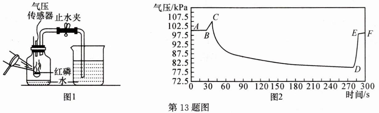 13. 图1是利用气压传感器测定红磷燃烧时集气瓶内气压变化的实验装置。点燃红磷,待红磷熄灭并冷却后,打开止水夹。瓶内气压的变化如图2。下列说法不正确的是 ( )