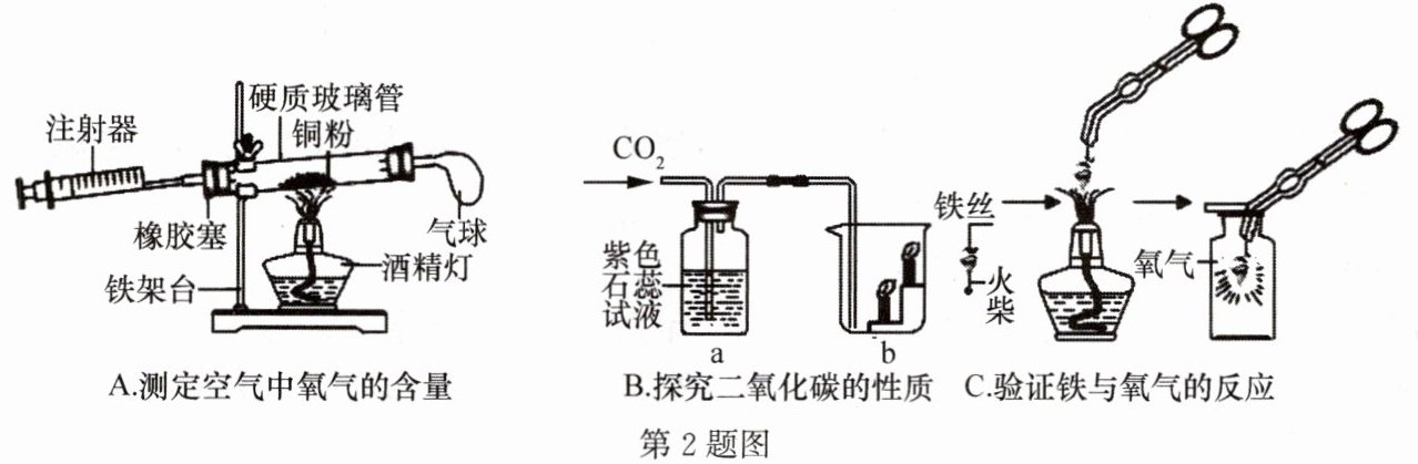 (2)B实验a中看到的现象是____,用化学方程式表示该现象的原因:____;b装置中的现象能说明二氧化碳具有____性质,这一性质在实际生活中的应用为____。
