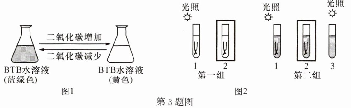 3. 化学试剂BTB(溴麝香草酚蓝)水溶液颜色变化可反映出水中二氧化碳含量变化,原理如图1所示。生物小组的同学利用黑藻和BTB溶液设计实验,探究“光合作用是否吸收二氧化碳”。请回答问题: