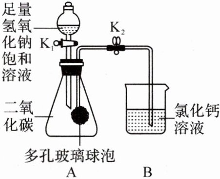 (2) 该同学进一步分析后确定,继续实验仍可证明氢氧化钠溶液能与二氧化碳反应。为利于观察现象,打开$K_{2}$前A装置需要______;打开$K_{2}$,观察到的现象是______,该过程中多孔玻璃球泡的主要作用是______。
