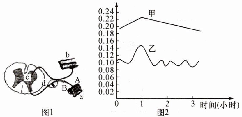 (1)赵大爷在进行肌肉注射时,肌肉出现不自主地战栗,而后感觉到疼痛。“战栗”是一种反射活动,完成该过程的神经结构为反射弧(如图1)。