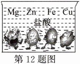 12. 如图是取大小形状相同的$Mg$、$Zn$、$Fe$、$Cu$四种金属与相同浓度的稀盐酸反应状况的示意图。仔细观察并结合所学的知识回答下列问题: