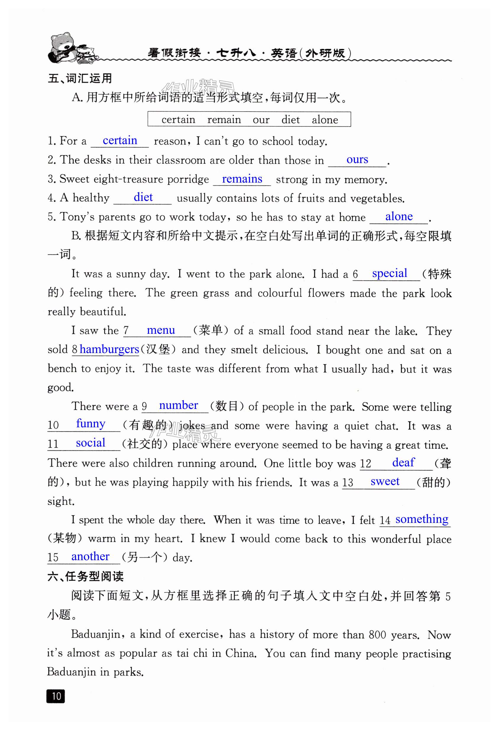 注:目前有些书本章节名称可能整理的还不是很完善,但都是按照顺序排列的,请同学们按照顺序仔细查找。练习册 2025年暑假衔接七年级英语外研版延边人民出版社 答案主要是用来给同学们做完题方便对答案用的,请勿直接抄袭。