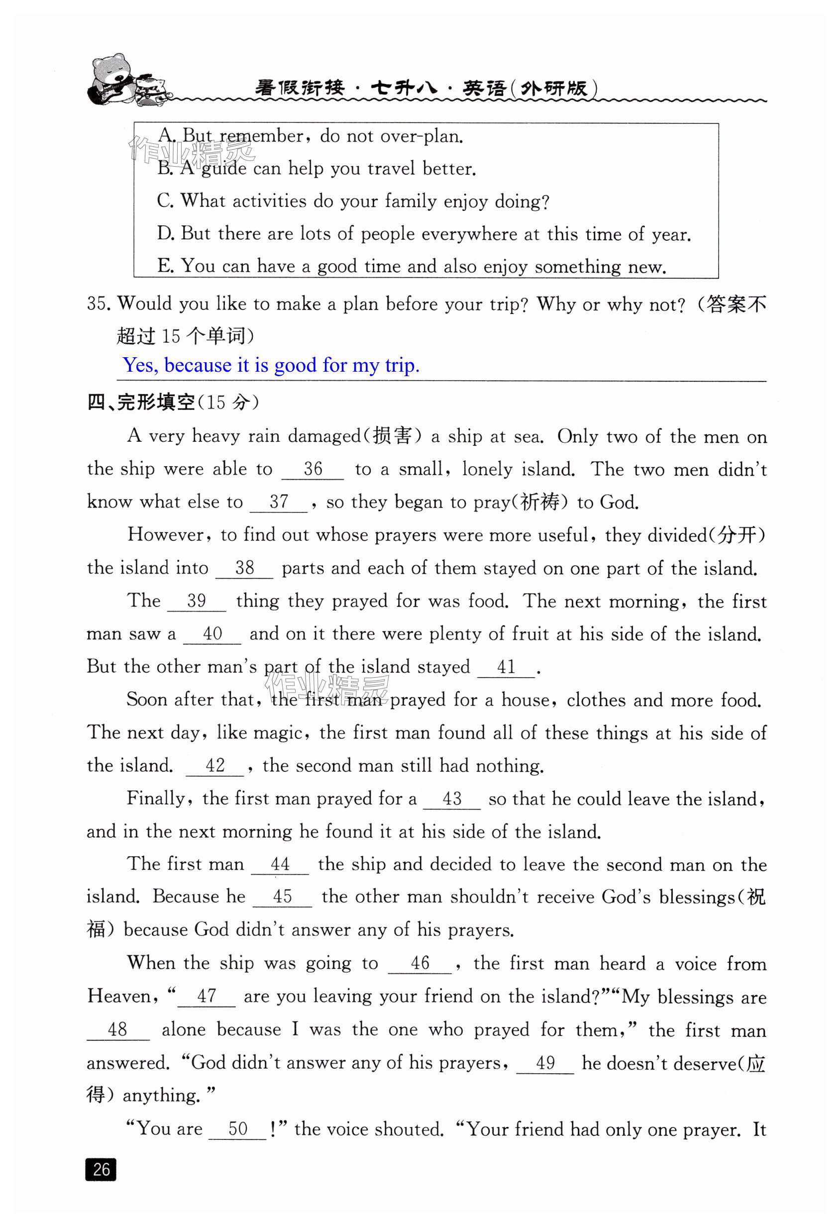 注:目前有些书本章节名称可能整理的还不是很完善,但都是按照顺序排列的,请同学们按照顺序仔细查找。练习册 2025年暑假衔接七年级英语外研版延边人民出版社 答案主要是用来给同学们做完题方便对答案用的,请勿直接抄袭。