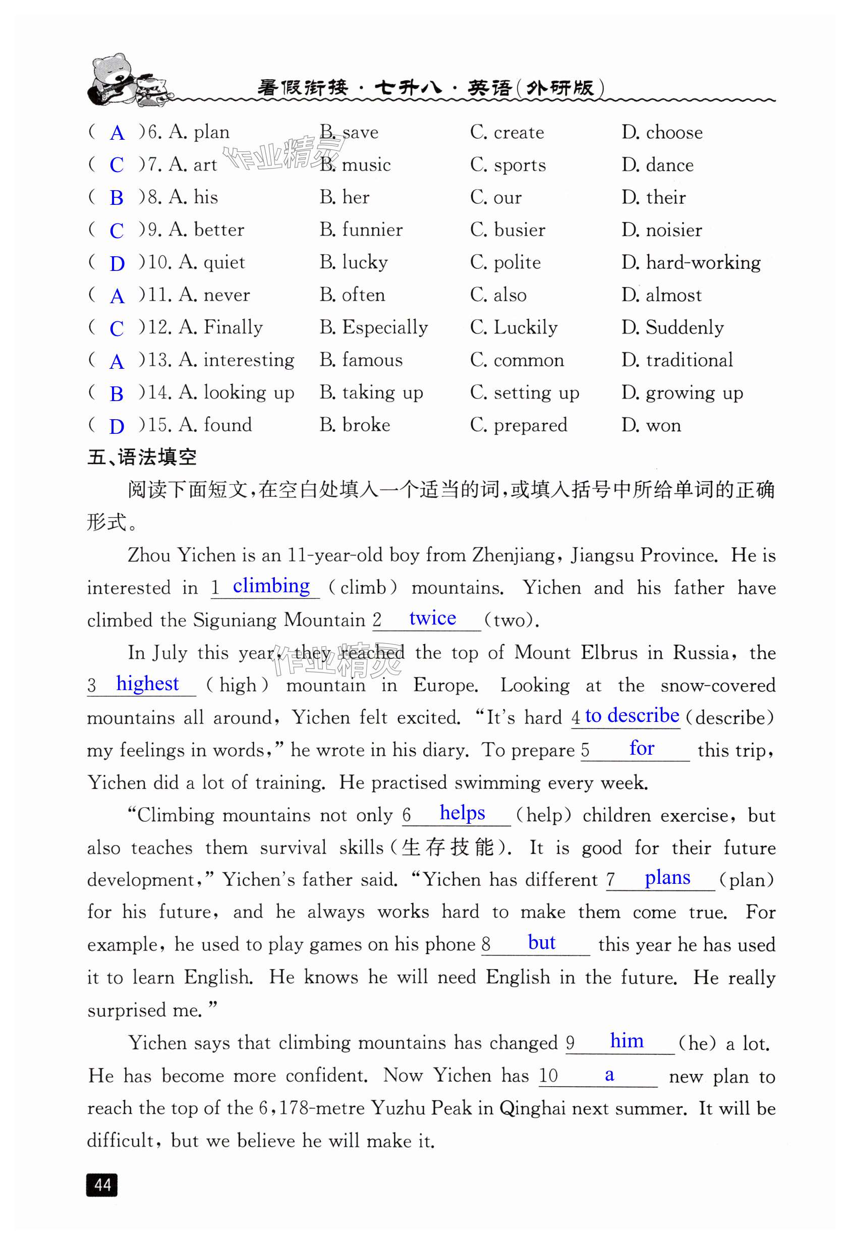 注:目前有些书本章节名称可能整理的还不是很完善,但都是按照顺序排列的,请同学们按照顺序仔细查找。练习册 2025年暑假衔接七年级英语外研版延边人民出版社 答案主要是用来给同学们做完题方便对答案用的,请勿直接抄袭。