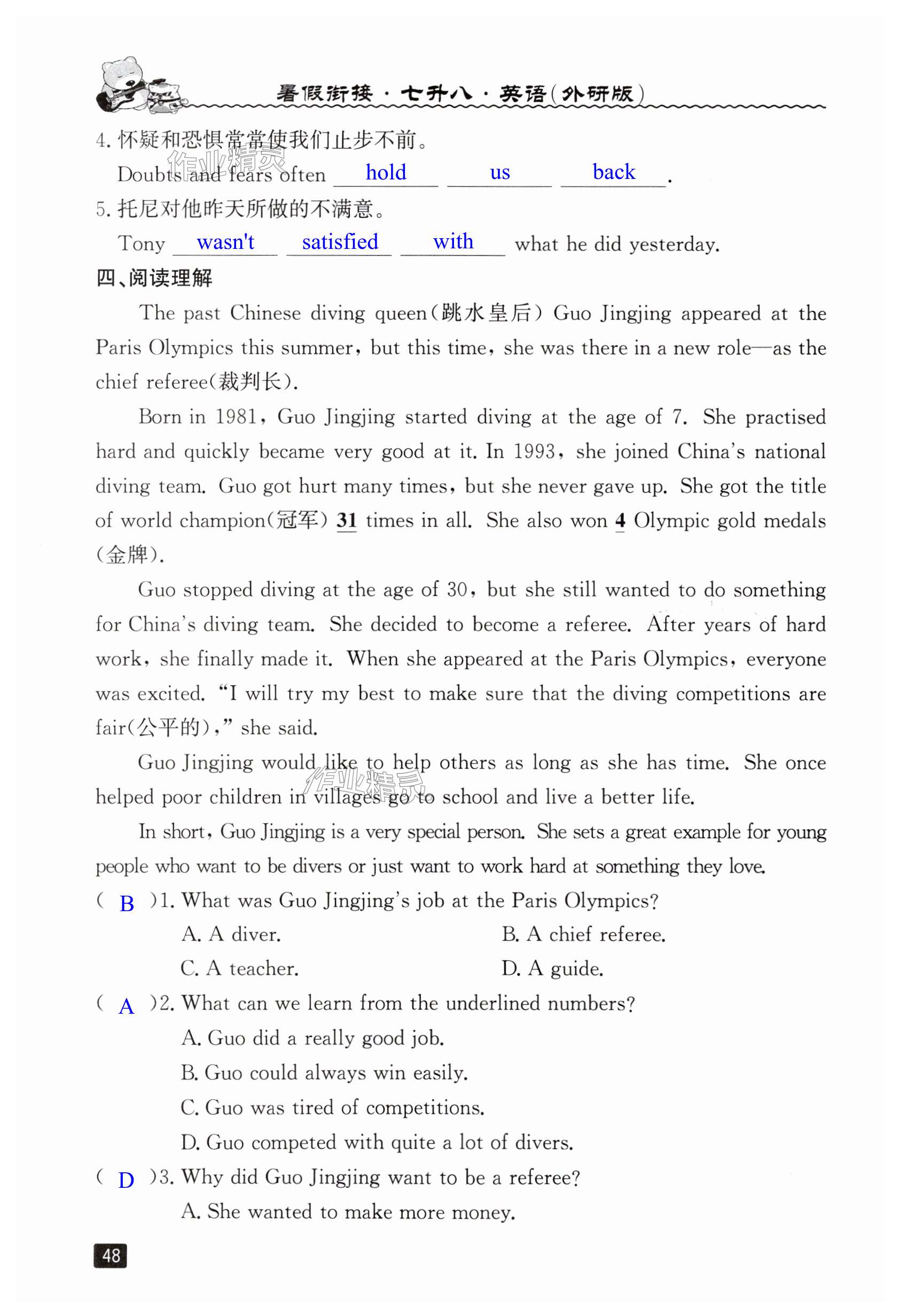 注:目前有些书本章节名称可能整理的还不是很完善,但都是按照顺序排列的,请同学们按照顺序仔细查找。练习册 2025年暑假衔接七年级英语外研版延边人民出版社 答案主要是用来给同学们做完题方便对答案用的,请勿直接抄袭。