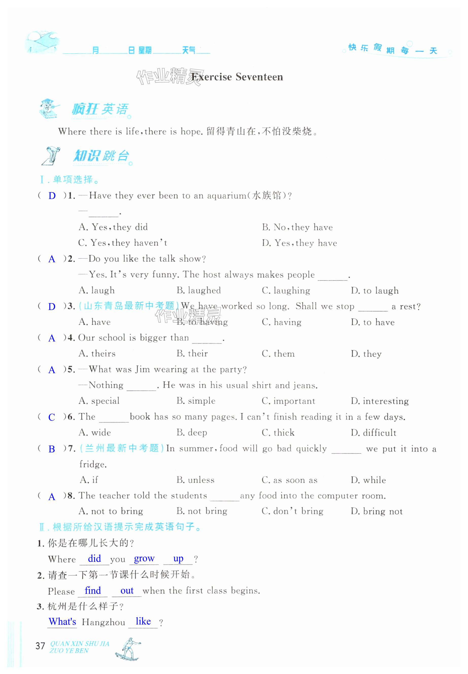注:目前有些书本章节名称可能整理的还不是很完善,但都是按照顺序排列的,请同学们按照顺序仔细查找。练习册 2025年优秀生快乐假期每一天全新暑假作业本八年级英语人教版 答案主要是用来给同学们做完题方便对答案用的,请勿直接抄袭。