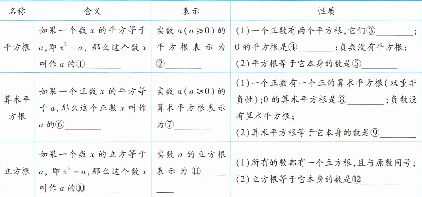 ①平方根或二次方根 ②$\pm \sqrt {a}$ ③互为相反数 ④0 ⑤0 ⑥算术平方根 ⑦$\sqrt {a}$ ⑧0 ⑨0 和 1 ⑩立方根或三次方根 ⑪$\sqrt [3]{a}$ ⑫0 和$\pm 1$